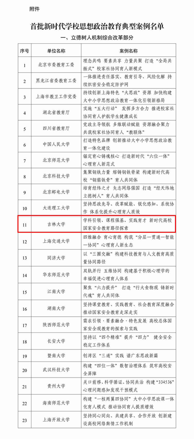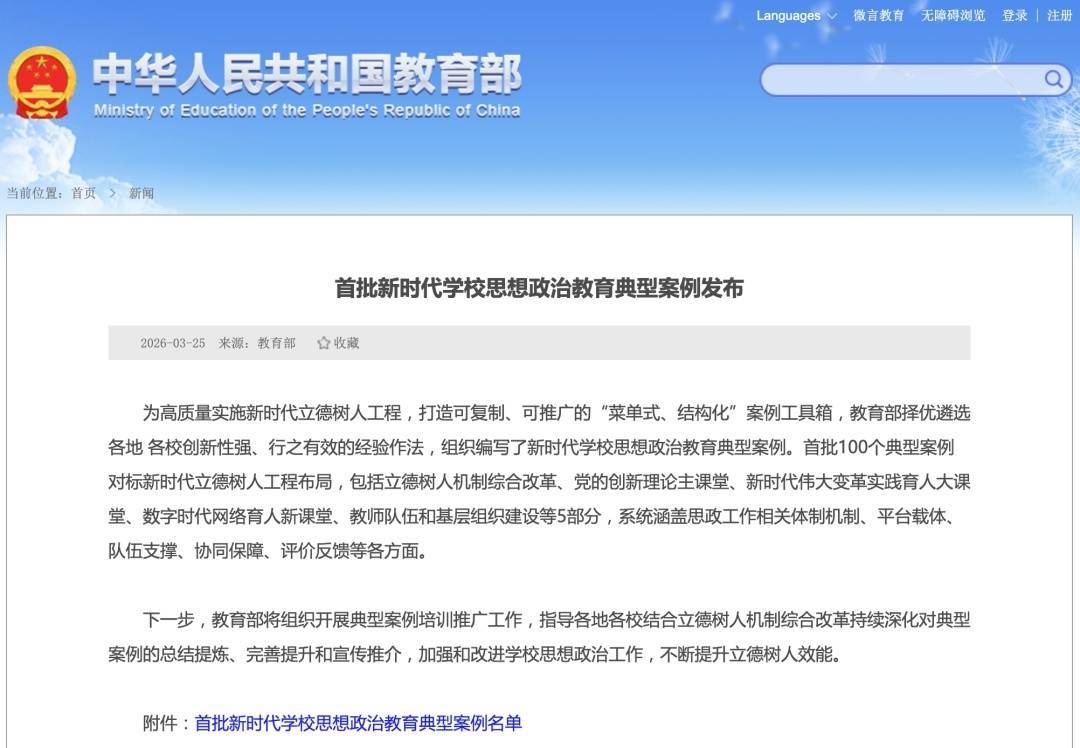 为扎实推进立德树人机制综合改革,加强和改进学校思想政治工作,不断提升立德树人效能,教育部择优遴选各地各校创新性强、行之有效的经验作法,组织编写了新时代学校思想政治教育典型案例。首批100个典型案例对标新时代立德树人工程布局,包括立德树人机制综合改革、党的创新理论主课堂、新时代伟大变革实践育人大课堂、数字时代网络育人新课堂、教师队伍和基层组织建设等5部分,系统涵盖思政工作相关体制机制、平台载体、队伍支撑、协同保障、评价反馈等各方面。