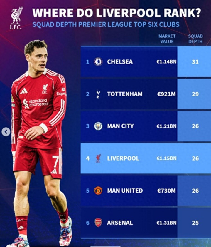 对此,利物浦主帅斯洛特在输给水晶宫的比赛后为自己惨淡的战绩找理由,他是如此抱怨的:利物浦本赛季人手不足。斯洛特的言论立马遭到了德转列出英超Big6球队阵容深度数据“打脸”。