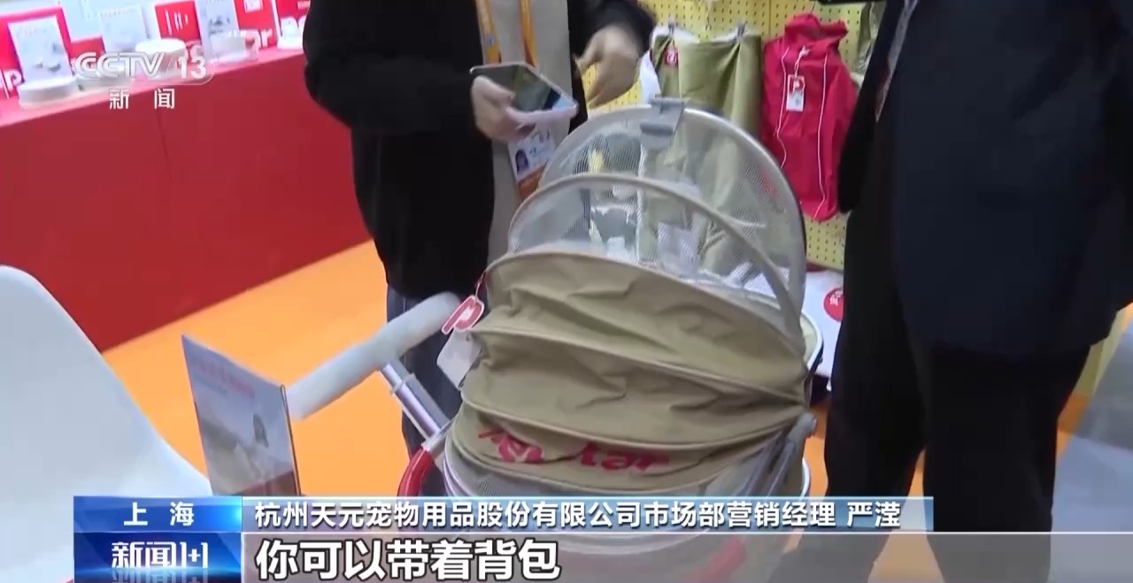 杭州天元宠物用品股份有限公司市场部营销经理 严滢:目前来说,养宠的话已经不像以前单纯只是说给宠物吃饱喝足就够了,现在更多是把宠物带入到人的生活,以家庭成员的身份去对待。所以我们也是契合了这次萌爪航站楼的主题,给宠物准备出行前、出行中、出行后的物品,带宠物一起游玩。比如会有一个推车呈现在这个地方,就是说宠物你可以推着它出去,然后更小的宠物你可以带着背包背它出去。