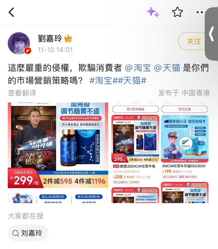 11月10日,演员刘嘉玲发布微博,晒出两张淘宝页面截图,并喊话淘宝、天猫:“这么严重的侵权,欺骗消费者专业配资开户,淘宝、天猫,是你们的市场营销策略吗?”