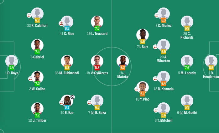 水晶宫首发:1-亨德森、2-穆尼奥斯(92'24-索萨)、26-理查兹、5-拉克鲁瓦、6-格伊、3-米切尔(92'12-乌切)、20-沃顿(92'8-莱尔马)、18-镰田大地(74'19-休斯)、7-萨尔、10-皮诺(59'9-恩凯蒂亚)、14-马特塔