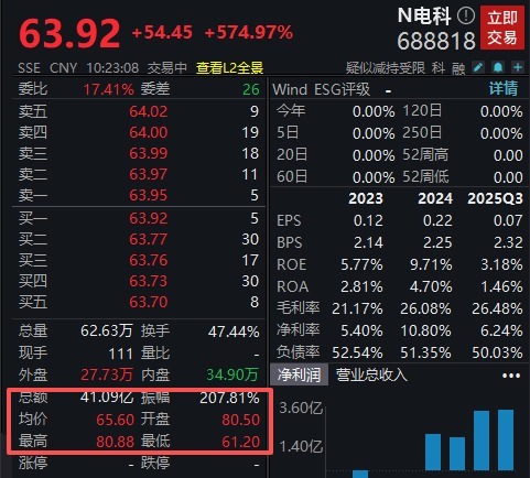 今日新股再现“肉签”,N电科开盘上涨超750%,之后迅速回落,截至发稿上涨574%。电科蓝天成立于1992年10月12日,是中国先进电能源系统解决方案和核心产品的供应商,主要从事电能源产品及系统的研发、生产、销售及服务,主营业务涵盖宇航电源、特种电源、新能源应用及服务三大板块,产品应用覆盖从深海至深空的广泛领域。本次发行价格为9.47元/股,发行市盈率为56.79倍。