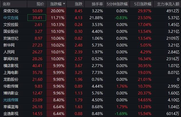 文化传媒板块再现批量涨停,捷成股份、荣信文化20%涨停,中文在线涨超11%,文投控股、国安股份、欢瑞世纪、新华网、人民网、掌阅科技、横店影视、上海电影等涨停。光线传媒、幸福蓝海、金逸影视等涨幅居前。