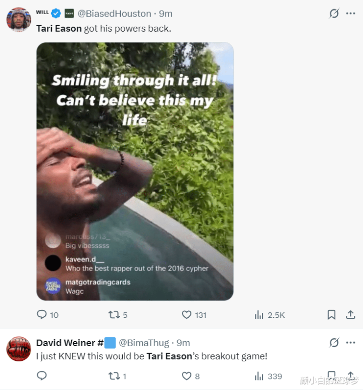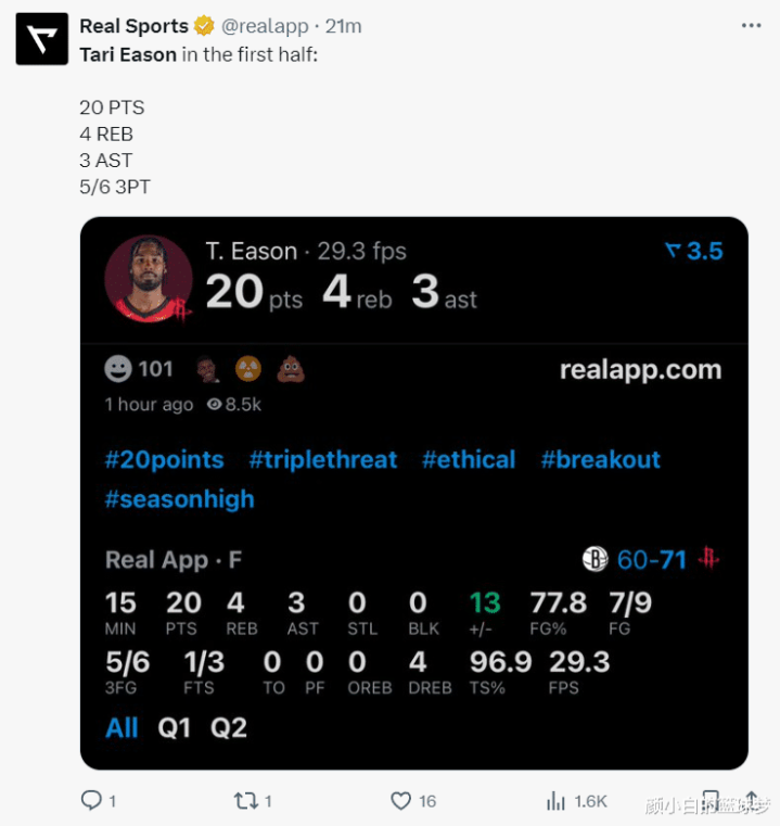 这第三场比赛伊森就迎来了觉醒,第一节伊森命中两个三分球时休斯顿媒体们就陷入了疯狂,纷纷高呼伊森归位了,首节伊森已经拿到了8分3篮板1助攻。